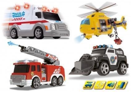 Małe pojazdy Action Series bez napędu, ze światłem i dźwiękiem, z ruchomymi elementami, do wyboru wóz policyjny, ambulans, helikopter i wóz strażacki.UWAGA!Towar wybierany losowo. przeczytaj całość