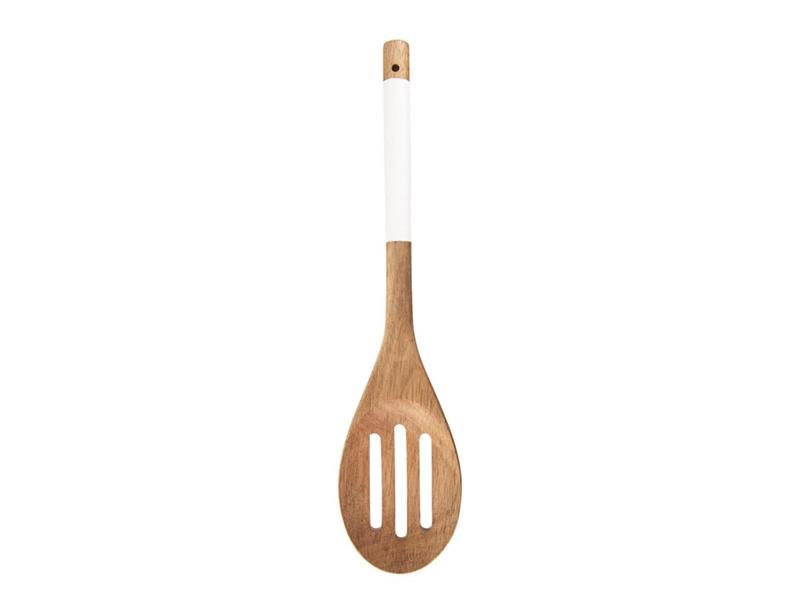 Łyżka ORION WHITELINE wykonana jest z drewna akacjowego, co gwarantuje jej wytrzymałość i długą żywotność. Dzięki oryginalnym otworom idealnie nadaje się do mieszania potraw, ponieważ przez otwory łatwo przepływają płyny i kawałki składników. Owalny kształt łyżki ułatwia także manipulację i zapobiega uszkodzeniu powierzchni garnków i patelni.