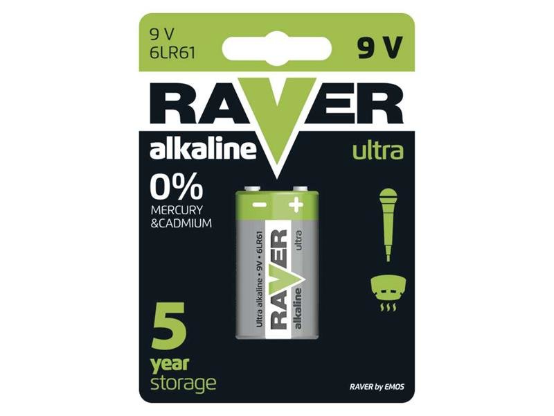 Bateria alkaliczna RAVER 9V (6LF22). Podstawowa seria baterii alkalicznych charakteryzuje się czasem pracy w urządzeniach o niskim zapotrzebowaniu energetycznym. Wydajność tych baterii najlepiej ujawnia się przy użyciu w urządzeniach o małym, długotrwałym poborze prądu W porównaniu z bateriami cynkowo-węglowymi i cynkowo-chlorkowymi mają długi okres przydatności do przechowywania - do 5 lat - oraz ochronę przed wyciekiem. Zakres temperatur pracy: -20 °C do +60 °C. Parametry techniczne: