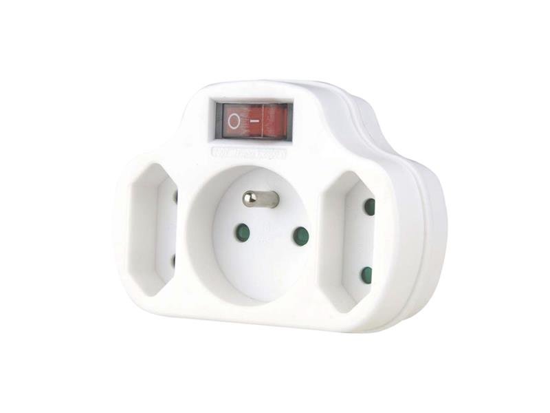 Rozgałęźnik 2x płaskie + 1x okrągłe gniazdo + włącznik Rozgałęźnik (adapter) 3x (2x2P, 1x2P+PE) z włącznikiem ~250 V/10 A max.
