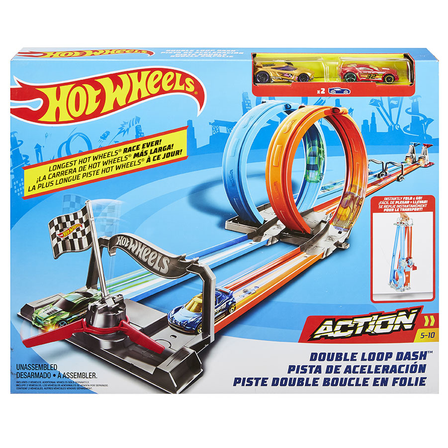 Double Loop Dash ™, novinka pro rok 2019, je Hot Wheels® NEJDELŠÍ EVER side-by-side drag race! Děti závodí po trati a kolem smyčky, aby jako první dosáhly cílové brány a aktivovaly vlajku pro vítězství! Tuto univerzální sadu lze znovu sestavit v režimu pro jednoho hráče na jednu opravdu dlouhou...