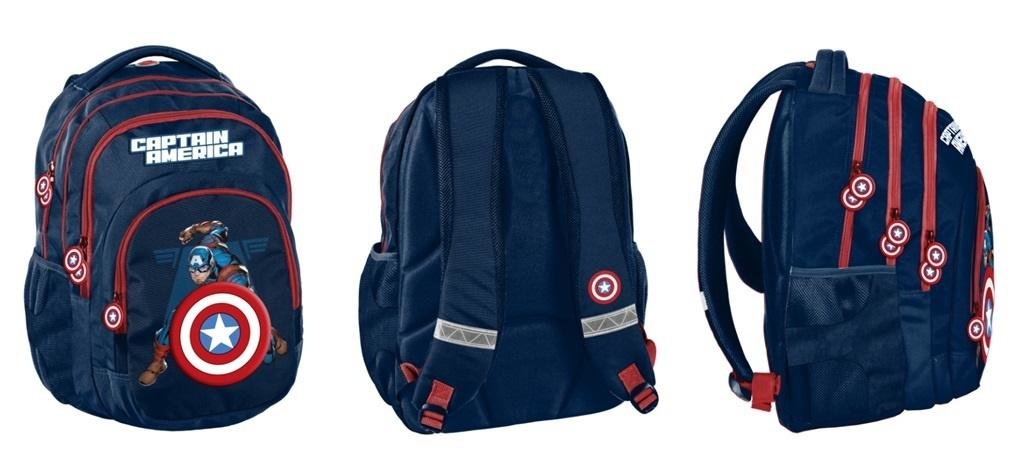 Plecak szkolny. Trzy pojemne komory, kieszeń przednia z organizerem, 2 boczne kieszenie z siatki+materiał. Wzmocnione profilowane plecy, miękkie wygodne szelki. Wzmocniony i usztywniony spód. Wygodny uchwyt do przenoszenia i uszko do powieszenia. W komorze głównej przegroda (na laptop), w drugiej komorze organizer z kieszenią na zamek, uchwyt na klucze. Elementy odblaskowe dla większego bezpieczeństwa.