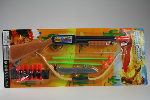 Zestaw western zawiera karabin na przyssawki o długości ok. 48 cm z 6 przyssawkami, plastikowy łuk o długości ok. 35 cm i 2 strzały, plastikowy nożyk. Wiek 3+ przeczytaj całość