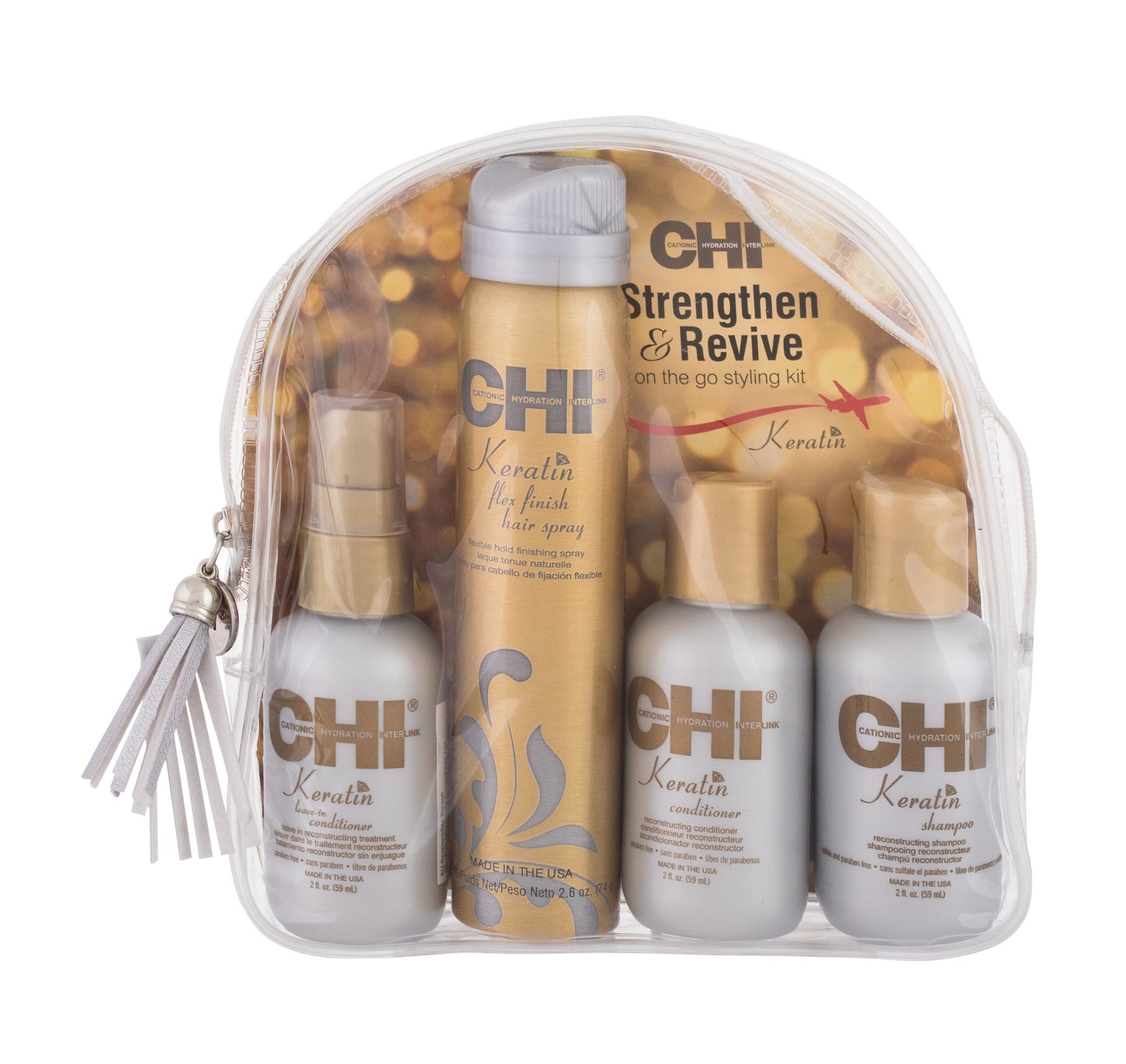 Farouk Systems CHI Keratin šampon Keratin Shampoo 59 ml + kondicionér Keratin Conditioner 59 ml + bezoplachový kondicionér Keratin Leave-in Conditioner 59 ml + lak na vlasy Keratin Flex Finish Hair Spray 74 g + kosmetická taštička