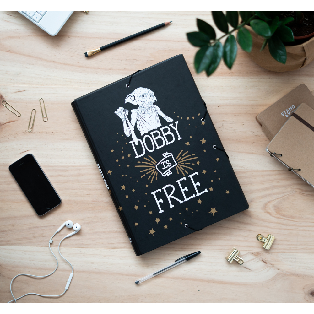 Oficiální složka a doplňkové zboží z katalogu produktů s licencí filmové a knižní ságy Harry Potter.Zboží je legálně licencováno a prodáváno se souhlasem vlastníků licenčních práv.Složka na sešity velikosti A4 s 3 klopami a stahovací gumou inspirovaná skřítkem Dobbym a nápisem "Dobby Is Free" (v...