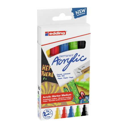 Sada 5 akrylových popisovačů edding 5100 M v základních barvách pro spontánní kreativitu na světlých i tmavých površích materiálů jako je plátno, malířský papír, hladké dřevo a kámen.