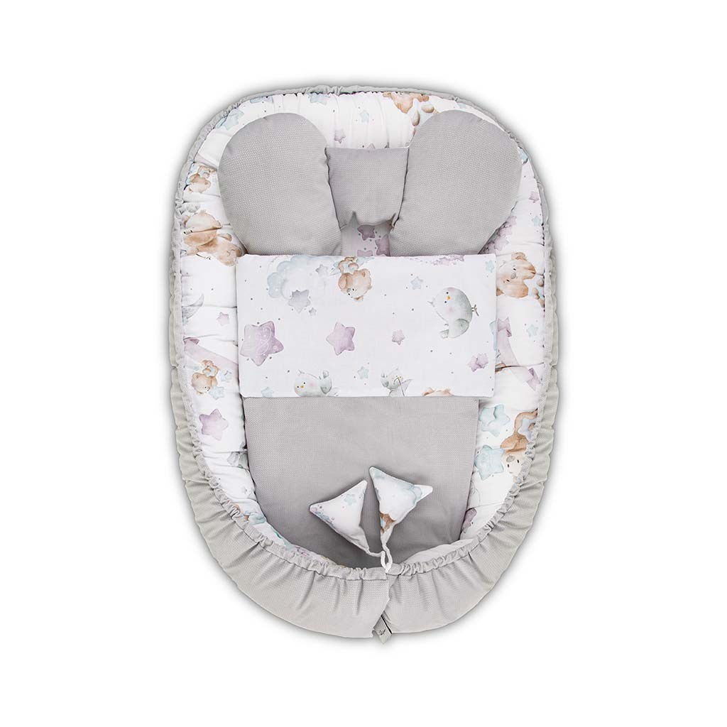 Hnízdo s peřinkou pro miminka Velvet Belisima Teddy on the moon. Navozuje miminkům pocit bezpečí, kopíruje tvar mámina těla a děťátko se tak cítí spokojeně jako u maminky v bříšku. Součástí hnízda je i stabilizační polštářek a peřinka. Miminku se daleko lépe usíná a je klidnější. Složení: 100%...