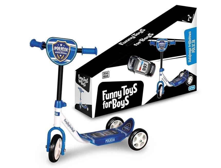 Hulajnoga trójkołowa, metalowa. Średnica kół: przód 13cm, tył 11cm, regulowana kierownica - wys. 63/68cm, szerokość 31cm.Wymiary podestu antypoślizgowego: 35x10,5cm. Maksymalne obciążenie: 20kg. Wymiary opakowania: 48x33x12cm. Wiek: 3+. przeczytaj całość