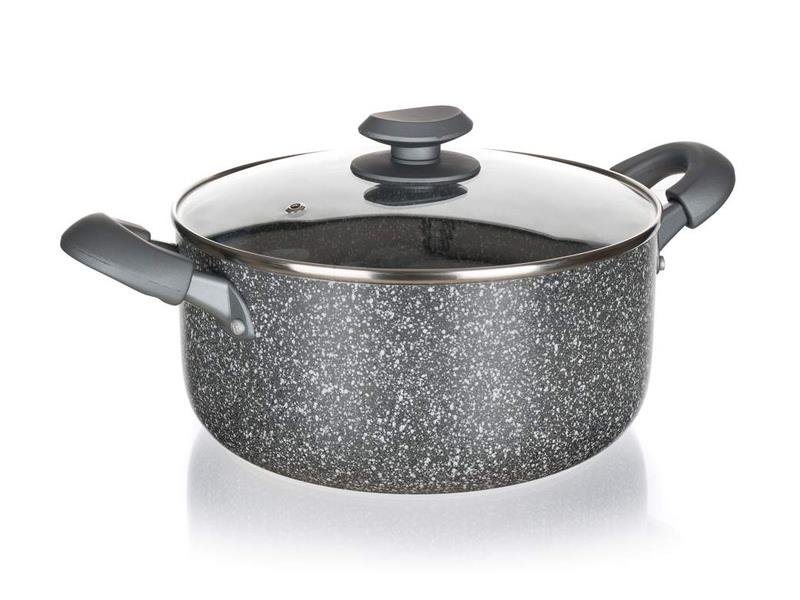Tłoczony aluminiowy garnek GRANITE 20 x 9 cm z nieprzywierającą, dwuwarstwową powłoką w dekorze granitu, szarą bakelitową rączką z powłoką soft-touch oraz całkowicie indukcyjnym dnem.