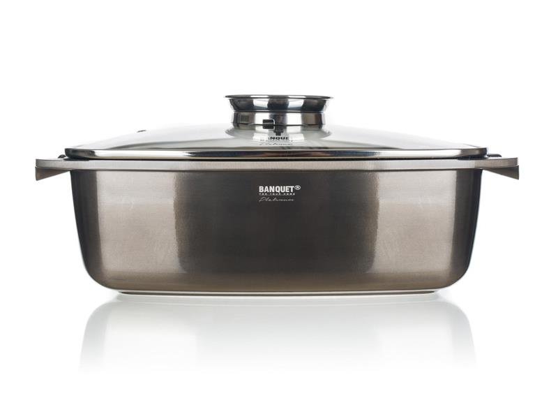Aluminiowa brytfanna ze szklaną termiczną pokrywą i aromatycznym pokrętłem o długości 4 dcm i pojemności prawie 6 litrów. Wysokiej jakości nieprzywierająca powłoka, która jest bardzo odporna nawet na uderzenia, zapobiegnie wszelkim uszkodzeniom fizycznym produktu.