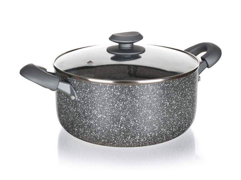 Tłoczony aluminiowy garnek GRANITE 18 x 8,5 cm z nieprzywierającą, 2-warstwową powłoką w dekorze granitu, z szarymi silikonowymi uchwytami, szklaną pokrywą z szarym silikonowym pokrętłem oraz w pełni indukcyjnym dnem.