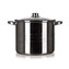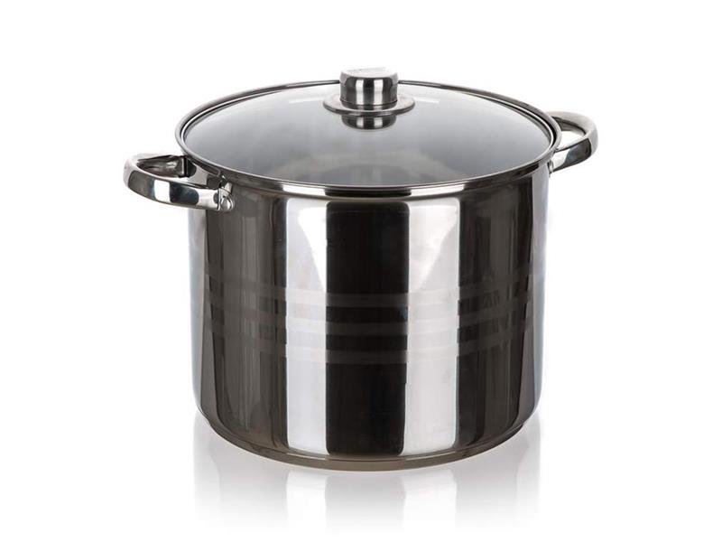 Garnek ze stali nierdzewnej LIVING 11,1 l, szklana pokrywka, stalowa gałka i uchwyty, błyszcząca powierzchnia wewnątrz i na zewnątrz, zewnętrzna strona ma trzy matowe pasy. Garnek można stosować na wszystkich typach płyt grzewczych, w tym indukcyjnych.