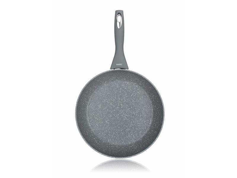 Hliníková litá kovaná pánev GRANITE GREY 28 x 5,3 cm s nepřílnavým povrchem, šedý granitový dekor, tloušťka stěny 3 mm, soft-touch rukojeť. Nepřilnavý povrch je velmi tvrdý a odolný proti poškrábání. Vysoká tepelná vodivost zajišťuje rychlé a ekonomické vaření - dlouho drží teplotu. Pánev je odolná proti nárazu a deformaci tvaru. Je vhodná na všechny typy varných desek včetně indukce.