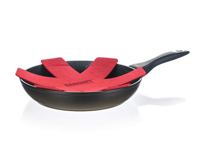 Kovaná hliníková pánev LUMIA 24 x 4,8 cm s 3vrstvým vnitřním nepřílnavým povrchem, vnější část v černém matném provedení s žáruvzdorným nástřikem. Pánev se vyznačuje novým technologickým prvkem, ochranný prstenec nad rukojetí se postupně se zvyšující teplotou mění z černé na sytě červenou barvu. Změna začíná při 40 st.C a postupně dochází k sycení červené barvy až do 70 st.C, kdy je pánev připravena k plnému vaření. Součástí balení je proložka na pánve v červené barvě.