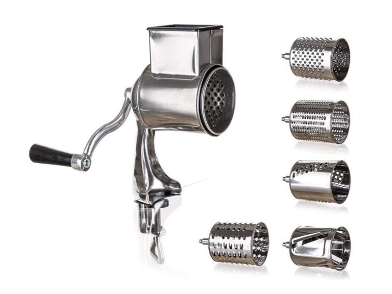 Uniwersalna nierdzewna tarka nadaje się do ścierania orzechów, czekolady, warzyw, owoców oraz do krojenia na plastry twardych serów. W zestawie znajduje się 5 nasadek, które ułatwiają ścieranie i krojenie w plastry. Tarka jest wyposażona w tłoczek zapewniający bezpieczne użytkowanie. Bębnowe tarki wykonane są z wysokiej jakości stali nierdzewnej.