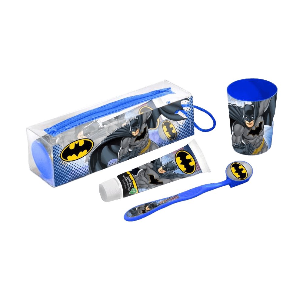 Dětská průhledná taštička s poutkem obsahuje modrý zubní kartáček s krytem s jemnými štětinkami, 75 ml zubní pasta s mátovou příchutí a kelímek na kartáček vše s motivem Batmana. przeczytaj całość
