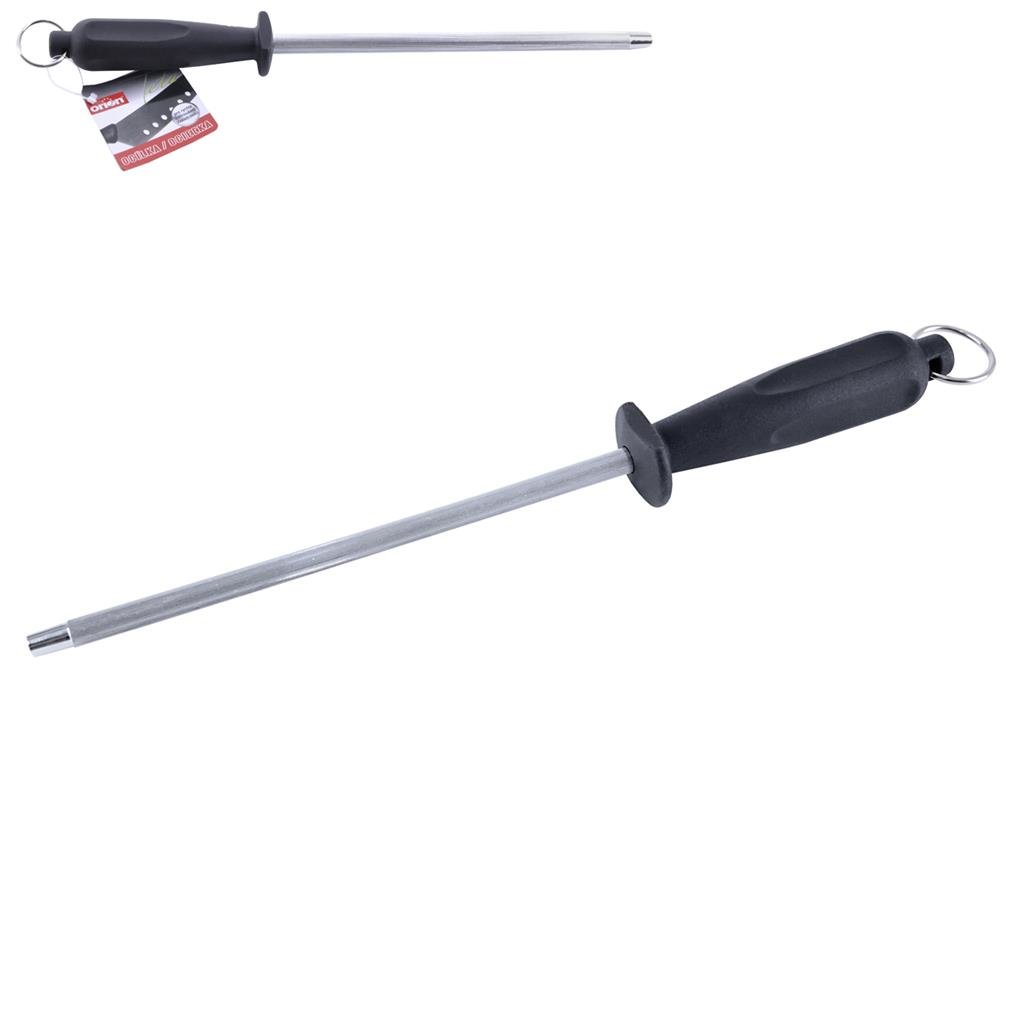 Ten przyrząd do ostrzenia posiada metalową powierzchnię wykonaną ze stali nierdzewnej, która skutecznie i delikatnie odświeży ostrze Twoich noży. Praktyczny plastikowy uchwyt zapewnia pewny i wygodny chwyt podczas ostrzenia, a dodatkowo pręt wyposażono w metalowe oczko do zawieszenia, dzięki czemu możesz mieć go zawsze pod ręką, nie zajmując miejsca w szufladzie ani na blacie.