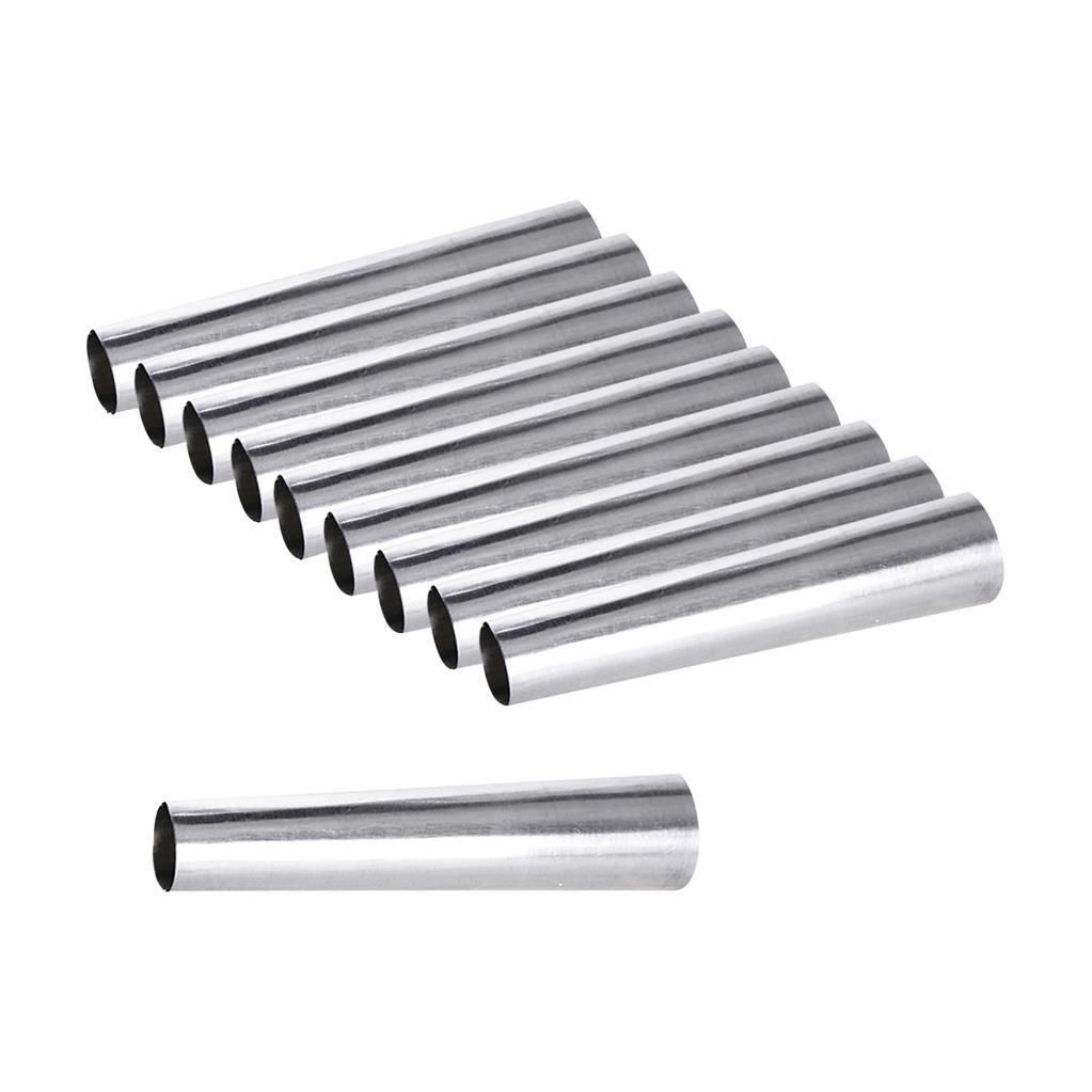 Rurki wykonane są z wysokiej jakości cynowanego metalu, który dobrze przewodzi ciepło i jest odporny na wysokie temperatury. Oznacza to, że Twoje kremrole będą pieczone równomiernie i uzyskają piękny złocisty kolor. Zestaw zawiera 10 sztuk rurek o następujących wymiarach: średnica 1,9 cm na węższym końcu i 2,3 cm na szerszym, długość 11,3 cm - idealny rozmiar do tradycyjnych i nowoczesnych przepisów.
