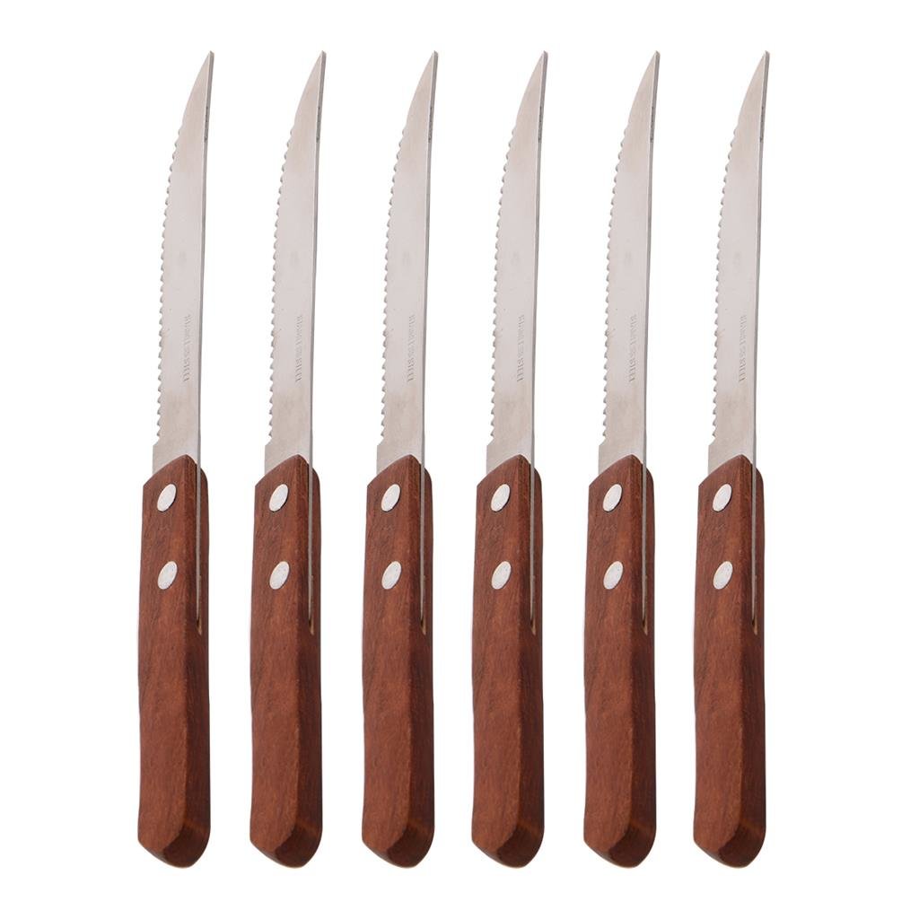 Nůž kuchyňský steakový se zubatým ostřím si hravě poradí nejen s grilovaným masem. Využijete ho především při venkovním grilování, ale bude se hodit i v domácnosti. Sada 6 kusů. Materiál: nerez, dřevěná rukojeť. Rozměry: délka 20,5 cm, délka čepele 11 cm. przeczytaj całość
