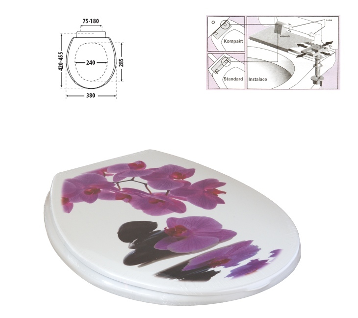 Deska sedesowa, siedzisko lub, jeśli wolisz, deska z pięknym nadrukiem orchidei z pewnością umili Ci pobyt w toalecie. Siedzisko jest kompatybilne z szeroką gamą standardowych modeli muszli klozetowych różnych producentów. Mocowanie deski WC można regulować za pomocą regulowanych zawiasów. Materiał: wysokiej jakości plastik. Wymiary patrz na obrazku. W ofercie znajdziesz także inne produkty w tym samym wzorze.
