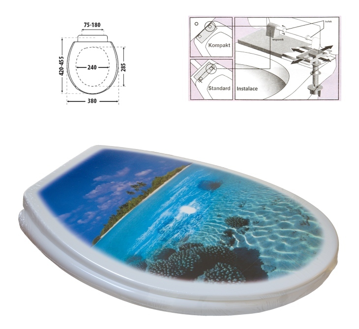 WC deska, sedátko nebo chcete-li prkénko s krásným potiskem moře ostrov vám zaručeně zpříjemní pobyt na toaletě. Sedátko je kompatibilní se širokou škálou standardních modelů toaletních mís od různých výrobců. Uchycení WC sedátka lze nastavit pomocí nastavitelných pantů. Materiál: kvalitní plast.... przeczytaj całość