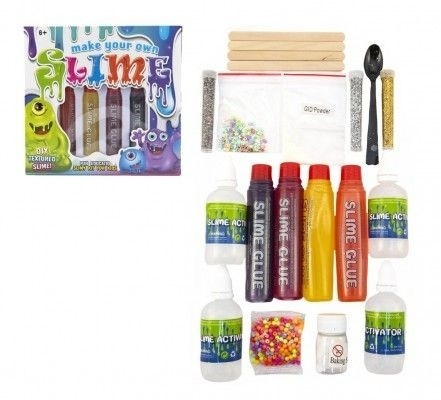 Gra, która wspomaga intelektualny rozwój dziecka: zdolności motoryczne, umiejętność pracy zespołowej, uczenie się, koncentrację, kreatywność. Stwórz sliz według własnej wyobraźni z tym dużym zestawem. Zawiera wiele dodatków (brokat, koraliki, kolorowe gwiazdki, proszek świecący w ciemności). Zawartość buteleczki (Slime glue) wylej do czystej miseczki lub kubeczka, dodaj brokat, koraliki, gwiazdki lub proszek świecący w ciemności oraz pół łyżeczki sody oczyszczonej i dokładnie wymieszaj. Dodaj całą buteleczkę aktywatora. Mieszaj, aż sliz zacznie gęstnieć i formować się. Jeśli sliz nadal jest lepki, dosyp 1/8 łyżeczki sody i kontynuuj mieszanie. Teraz gotowe. Życzymy dużo zabawy. Wymiary opakowania 27 x 25 x 4 cm. Nadaje się dla dzieci od 6 lat.