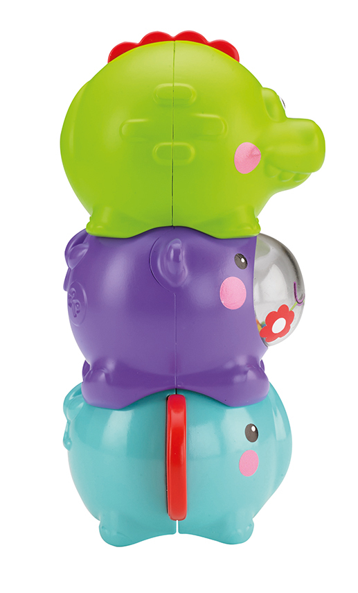 Hroch, slon a krokodýl je veselá trojice kamarádů, kterou lze snadno stavět na sebe. Každé zvířátko má jasné barvy, specifické rýhování a jedinečná chrastítka s rolničky, což dítě motivuje ke zkoumání a poznávání. Průhledný hroší nos obsahuje barevné chrastící kuličky, které po zatřesení poskakují. Zvířátka se dají stavět na sebe jakýmkoliv způsobem, čímž rozvíjí schopnost uvažovat a řešit problémy.