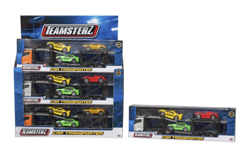 Ciężarówka transportowa Teamsterz z 3 autkami w różnych kolorach. Ciężarówka dostępna w kolorze srebrnym i pomarańczowym. przeczytaj całość