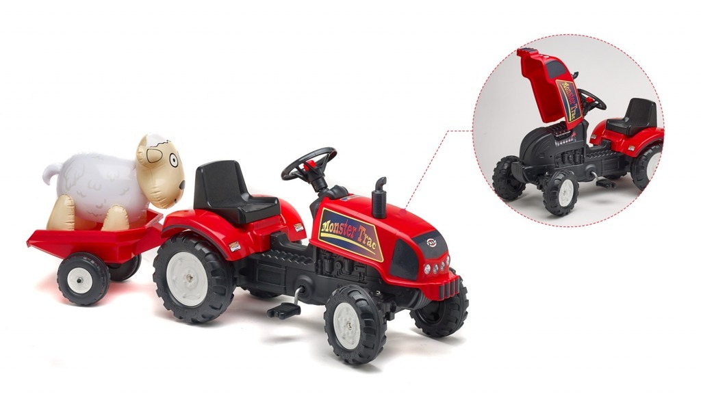 Traktor Trac s valníkem a otevírací kapatou červený. Součástí traktoru je klakson, přívěs,otvírací kapota motoru a nafukovací ovečka. Z vysoce odolného a kvalitního plastu. Velikost 132×42×52,5cm Věk 2+. Všechny traktory Falk jsou testovány na 30kg – dle požadavků evropských norem. Vyrobeno ve... przeczytaj całość
