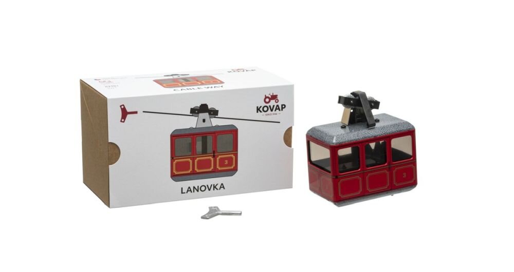 Oryginalna zabawka - model kolejki linowej na kluczyk, który potrafi jeździć po sznurku. Przejedzie około 4 metry przy maksymalnym przewyższeniu 0,5 metra. Sznurek jest częścią opakowania. Napęd kolejki zapewnia sprężynowy mechanizm na kluczyk, który jest wyposażony w hamulec uruchamiający lub zatrzymujący ruch kolejki po sznurku. Skala 1:43