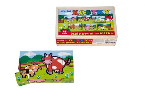 Dřevěné kostky s barevnými obrázky domácích zvířátek jsou výborná volba pro nejmenší.