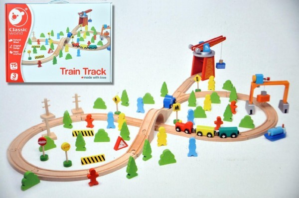 Vlak dřevo s dráhou + doplňky 75 ks v krabici 40x30x11cm