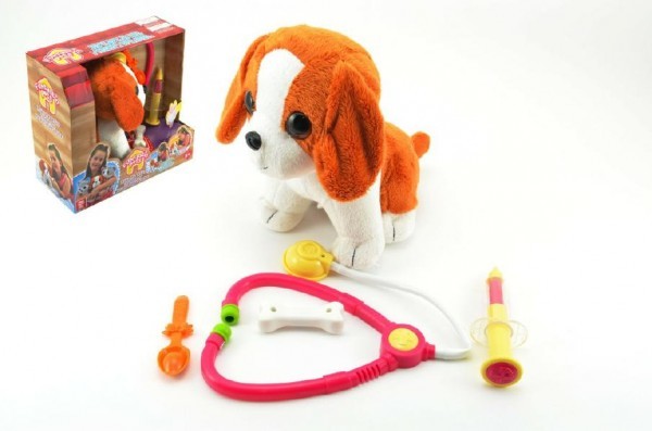Plyšovému pejskovi tluče srdce, když ho vyšetříte, kňučí, když mu píchnete injekci a pak se mu uleví, když mu dáte medicínu ze lžičky. Vydává zvuky spokojeného pejska, když mu přiložíte k tlamičce kostičku. Rozměr: 22 cm, na baterie, v krabici Rozměr balení: 31 x 28 x 15 cm Vhodný od 3 let przeczytaj całość