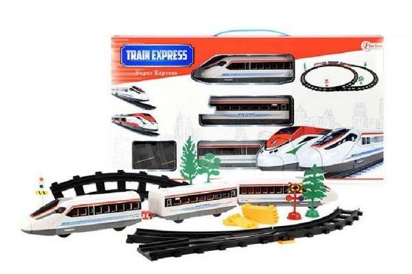 Vlak + 3 vagóny s kolejemi plast na baterie se světlem v krabici 48x26x5cm