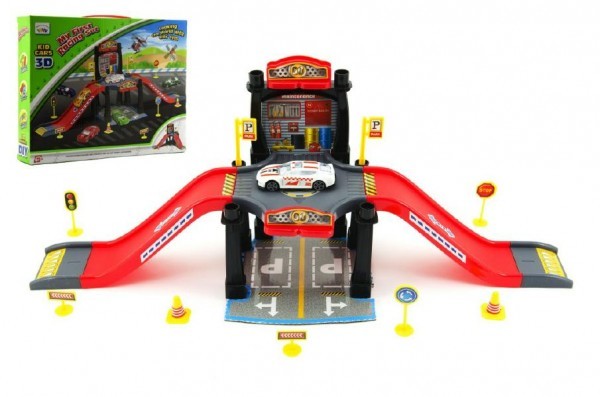 Garáž/Dráha s autem + doplňky plast 23ks v krabici 30x24x5cm