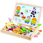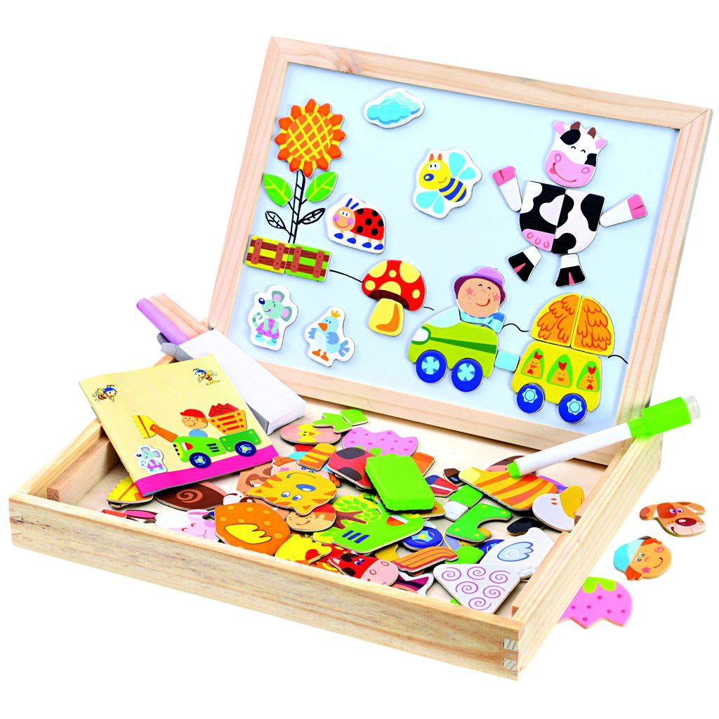 Dwustronna magnetyczna tablica z motywami farmy. Tablica jest dwustronna i można ją wykorzystać z obu stron. Na stronę magnetyczną można pisać markerem i przyczepiać tematyczne postacie oraz różne kształty. Na stronę kredową pisze się kredą, którą można łatwo zmazać. W zestawie znajduje się marker z filcem, kredy z małą gąbeczką oraz duża ilość elementów magnetycznych puzzli wraz z broszurą z pomysłami na układanie. Wszystkie części są przechowywane w drewnianym pudełku, które jest łatwe do przenoszenia. Dzieci mogą się bawić przez długi czas, z dala od internetu i iPada. Główne cechy: tablica, 3 kredy, gąbeczka, marker z filcem, magnesy i karta z wzorami, tablica dwustronna na kredę/markery, magnetyczna, praktyczne opakowanie