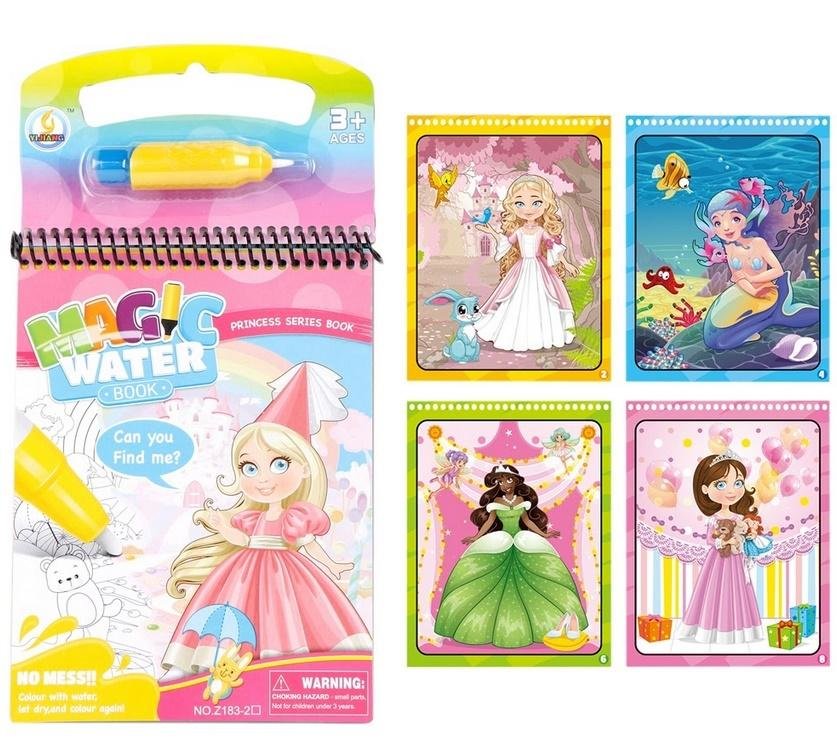 Książeczka do samodzielnego złożenia. Książeczka wielokrotnego wykorzystania.Strony kolorujemy pisaczkiem napełnionym wodą. Obrazek po zestknięciu z wodą nabiera barw.Po wyschnięciu ponownie strona jest do użytku.4 kartyWzór - księżniczkiWiek: 3+ przeczytaj całość