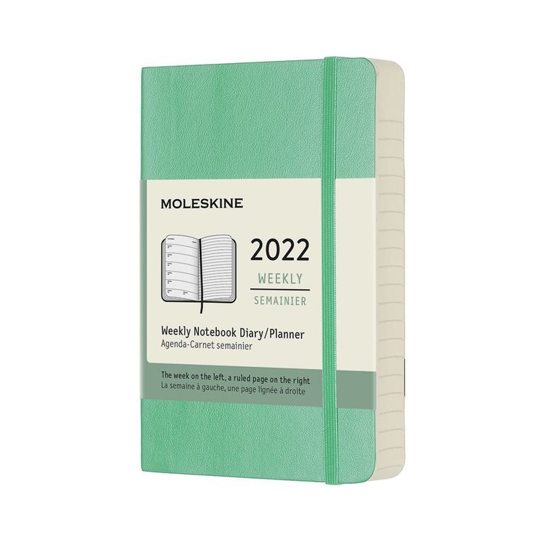 Zelený plánovací zápisník kapesní velikosti na rok 2022. Na levé straně jsou dny v týdnu a na pravé linkovaná stránka na poznámky. Zápisník má měkkou, ve hřbetu šitou vazbu. Obepíná ho pružná páska proti samovolnému otevírání. Obsahuje praktickou vnitřní kapsu, textilní záložku a 295 barevných...