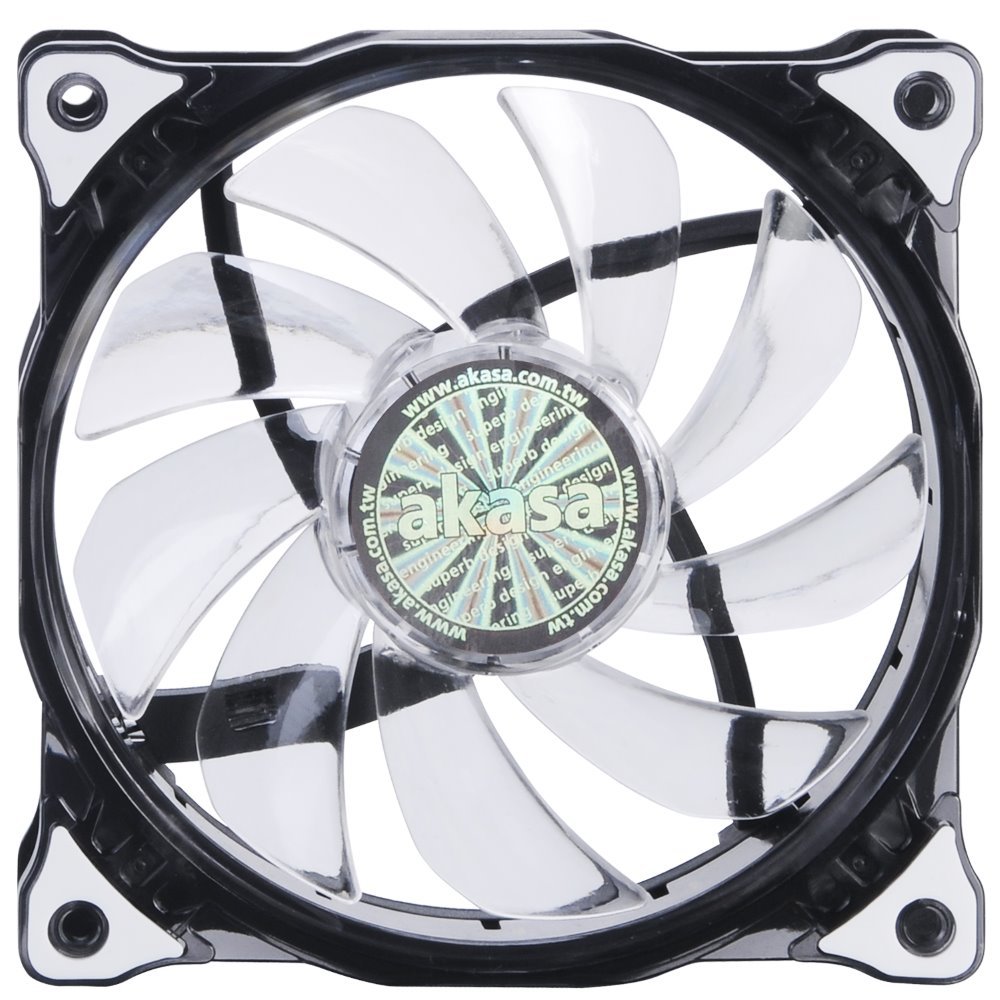 Ventilátor s bílým LED podsvícením. Ventilátor je extra tichý i díky distančním prvkům na těle ventilátoru. Díky tomu se přenáší méně vibrací do celé skříně. Průměr ventilátoru je 120 mm.