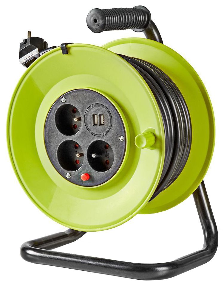 NEDIS kabelový buben/ 3x 1,5 mm2/ 3x zásuvka/ tepelná elektrická pojistka/ Typ E/ USB/ zeleno-černá/ 25 m