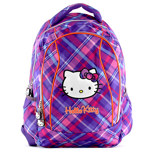 Kvalitně zpracovaný voděodolný batoh s vnitřním prostorem jednokomorovým odděleným přepážkou na suchý zip pro notebook, celý batoh bezpečně uzavíratelný na zip. Prostorná přední kapsa s malou síťovanou kapsičkou a přívěskem na klíče. Přední stranu zdobí oblíbená kočička s mašlí a nášivka Hello...