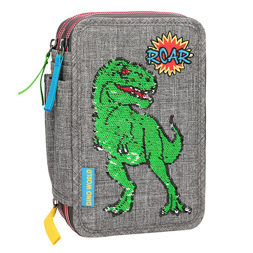 Penál s výbavou Dino World T-Rex s měnícími flitry, třípatrový, šedý
