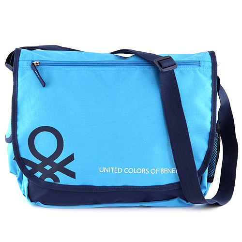 Taška přes rameno Benetton světle modrá s tmavě modrým lemováním a bílým nápisem