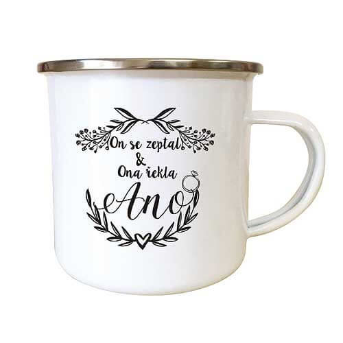 Dekorační plechový hrnek s potiskem pro novomanželeDrobný milý svatební dárek pro ženicha a nevěstu s textem: On se zeptal a ona řekla ANOPrůměr: 8 cmVýška: 8 cmStříbrný okraj. Tiskneme sublimační technologií na bílé plechové hrnky se stříbrným okrajem. Plecháčky jsou balené v bílé krabičce,...