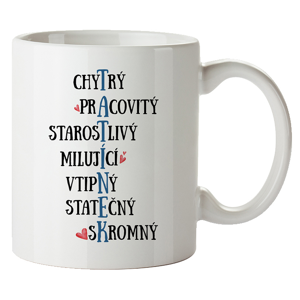 Keramický hrnek s potiskem - tatínekOriginální dárek pro tatínka k narozeninám, k svátku nebo pro radost.Průměr: 8 cmVýška: 9,5 cmObjem: 350 mlBalení: v kartonové krabičceTiskneme sublimační technologií na bílé keramické hrnky. Hrnky jsou balené v krabičce s potiskem, vydrží mytí horkou vodou,... przeczytaj całość