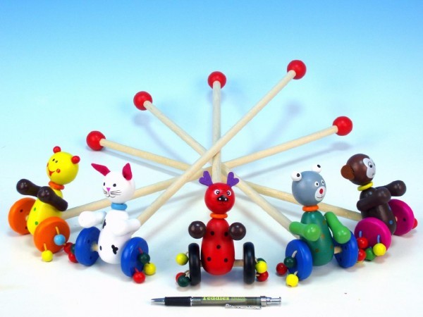 Figurka dřevo na kolečkách tlačící s tyčkou 13-14cm 10 druhů v sáčku - 1 kus
