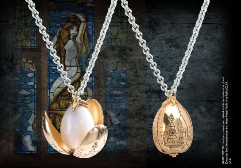 Věrně zpracovaný přívěsek dračího vejce je pozlacený a opatřený stříbrným řetízkem. Stejně jako originál, podle nějž je zhotoven, jej lze pootočením rozevřít. Součástí je drobná dřevěná skříňka se zrcátkem, v níž je možno náhrdelník vystavit. Velikost vejce 25 cm. Jedná se o filmovou dekorační...