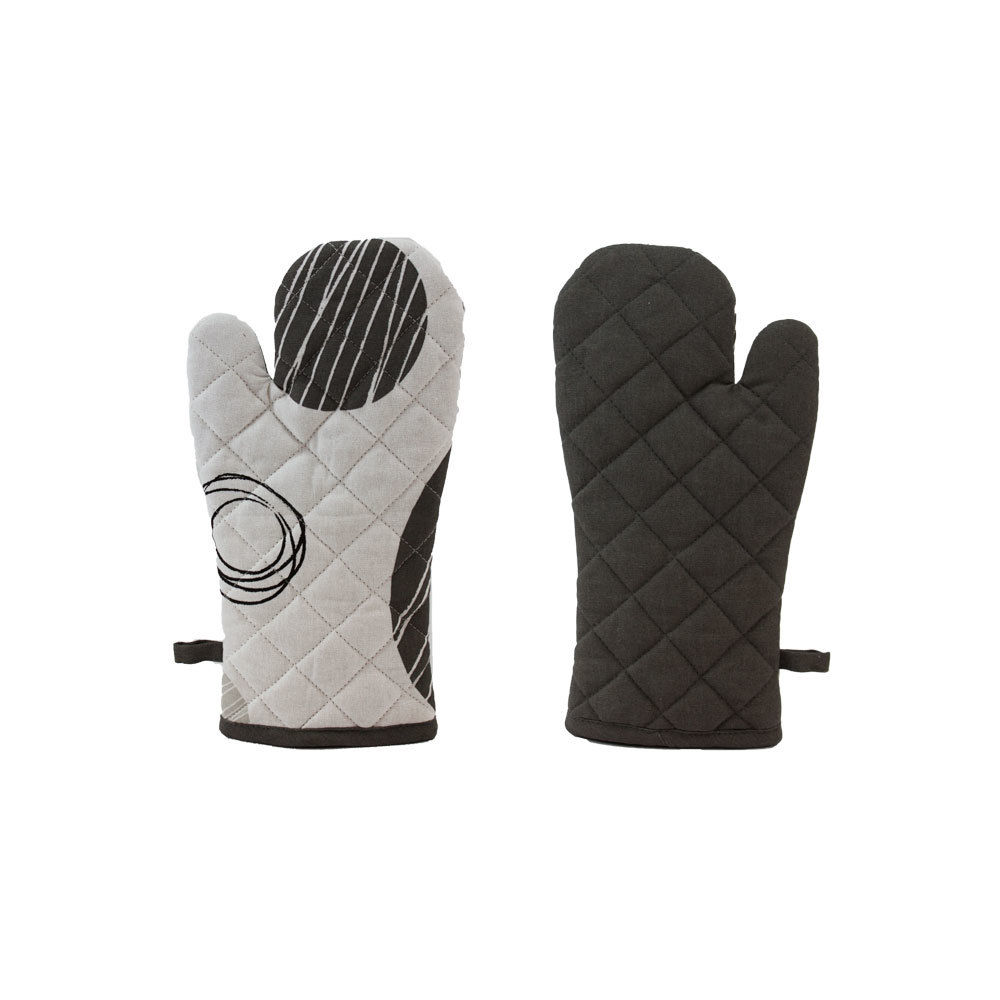 Kuchynská chňapka s decentním černobílým motivem kruhů. przeczytaj całość