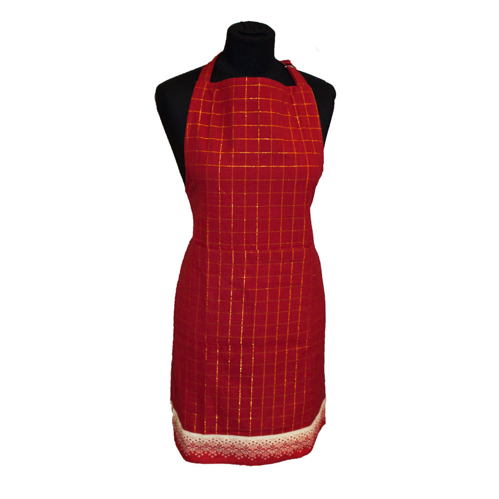 Červená vánoční kuchyňská zástěra.Produkt je prošity zlatými třpytivými nitkami przeczytaj całość