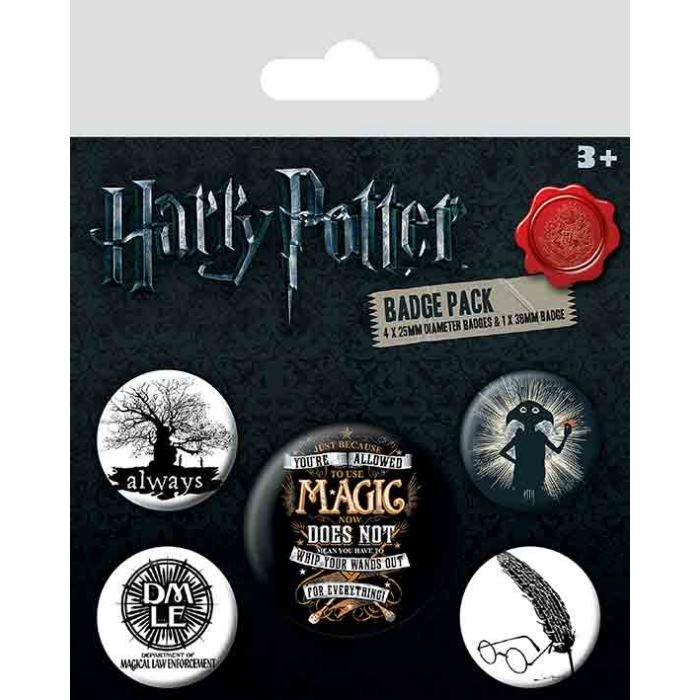 Zestaw zawiera 5 okrągłych przypinek w różnych rozmiarach - jedna większa i cztery mniejsze. Każda przypinka przedstawia jeden z charakterystycznych symboli z Harry’ego Pottera, które natychmiast pokażą Twoją pasję do tej legendarnej serii. To doskonały prezent nie tylko dla kolekcjonerów, ale także dla każdego, kto chce mieć odrobinę Hogwartu przy sobie.